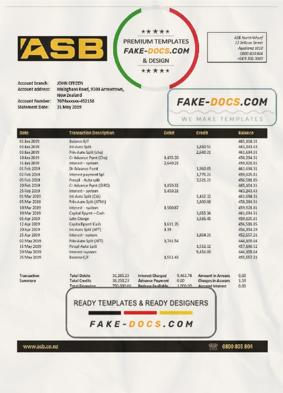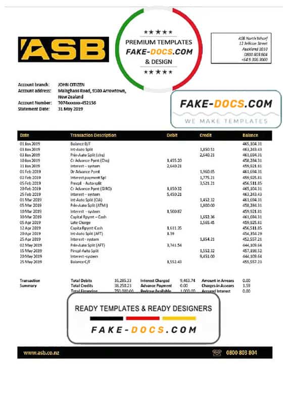 Grab now fully editable New Zealand ASB proof of addres Bank Statement Word Template from our website Fake Docs and put your own info to create Fake Bank Statement Word template and ready your own novelty documents. It’ll be so beneficial if your Bank Statement is expired, stolen or not available. We also have passport psd template, ID Card psd template, Bank Statement psd template, drivers license psd template & Utility bill psd template