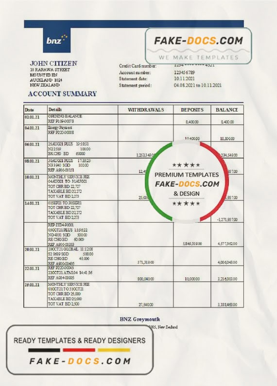 Grab now fully editable New Zealand BNZ Greymouth Bank Statement Excel Template from our website Fake Docs and put your own info to create Fake Bank Statement template Excel and ready your own novelty documents. It’ll be so beneficial if your Bank Statement is expired, stolen or not available. We also have passport psd template, ID Card psd template, Bank Statement psd template, drivers license psd template & Utility bill psd template