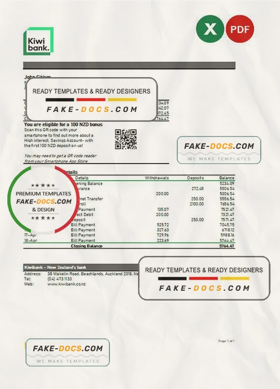 Grab now fully editable New Zealand Kiwibank Bank Statement Excel Template from our website Fake Docs and put your own info to create Fake Bank Statement template Excel and ready your own novelty documents. It’ll be so beneficial if your Bank Statement is expired, stolen or not available. We also have passport psd template, ID Card psd template, Bank Statement psd template, drivers license psd template & Utility bill psd template