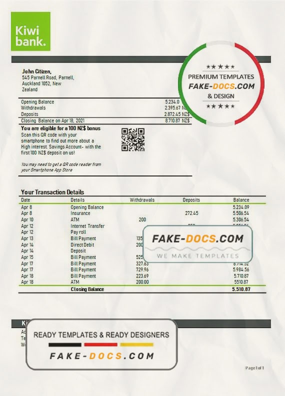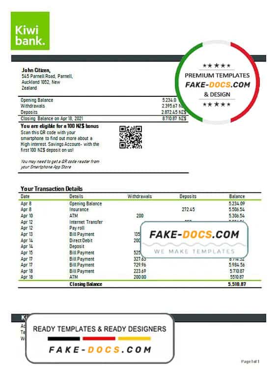 Grab now fully editable New Zealand Kiwibank Bank Statement Word Template from our website Fake Docs and put your own info to create Fake Bank Statement Word template and ready your own novelty documents. It’ll be so beneficial if your Bank Statement is expired, stolen or not available. We also have passport psd template, ID Card psd template, Bank Statement psd template, drivers license psd template & Utility bill psd template