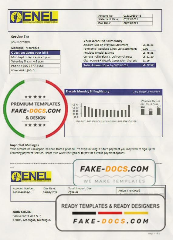 Grab now fully editable Nicaragua Nicaraguan Electricity Company ENEL electricity utility bill Template from our website fake docs and put your own info to create a fake copy of Fake Nicaragua Nicaraguan Electricity Company ENEL electricity Utility Bill for proof of address and ready your own novelty documents. It’ll be so beneficial if your utility bill is expired, stolen or not available. We also have passport psd template, ID Card psd template, Bank Statement psd template, drivers license psd template & Utility bill psd template