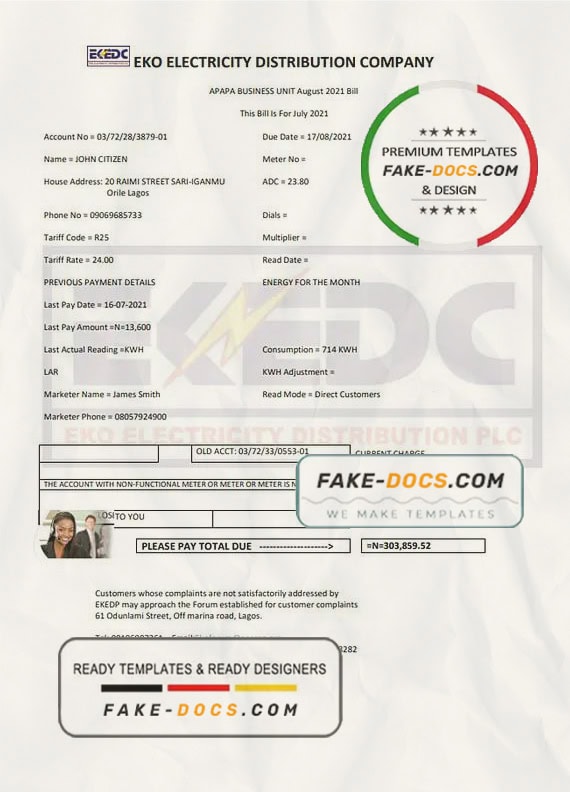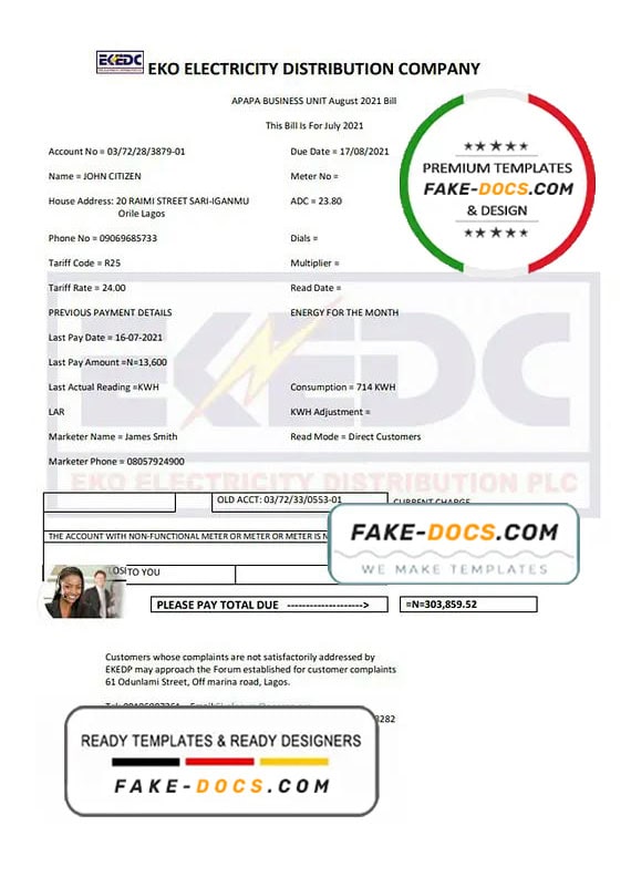 Grab now fully editable Nigeria Eko Electricity Distribution Company (EKEDC) utility bill Template from our website fake docs and put your own info to create a fake copy of Fake Nigeria Eko Electricity Distribution Company (EKEDC) Utility Bill for proof of address and ready your own novelty documents. It’ll be so beneficial if your utility bill is expired, stolen or not available. We also have passport psd template, ID Card psd template, Bank Statement psd template, drivers license psd template & Utility bill psd template