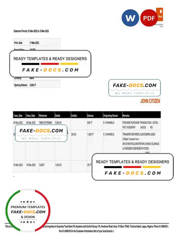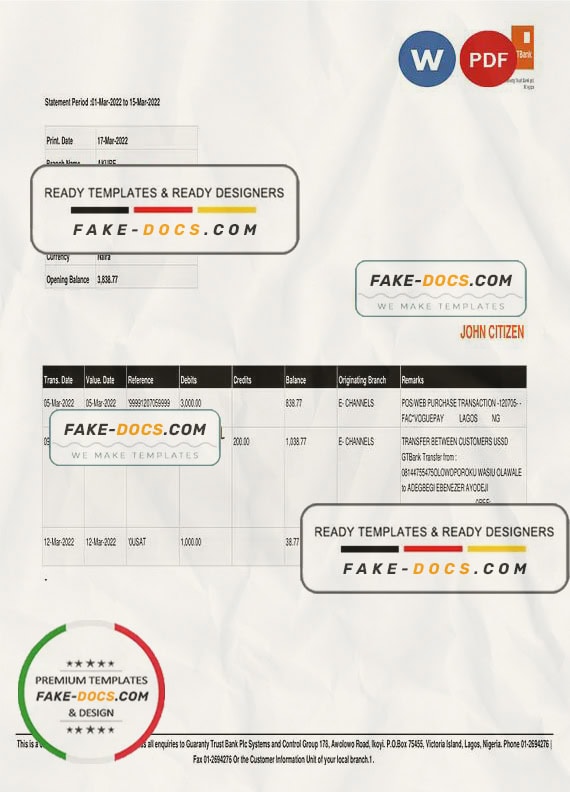 Grab now fully editable Nigeria Guaranty Trust Bank Statement Word Template from our website Fake Docs and put your own info to create Fake Bank Statement Word template and ready your own novelty documents. It’ll be so beneficial if your Bank Statement is expired, stolen or not available. We also have passport psd template, ID Card psd template, Bank Statement psd template, drivers license psd template & Utility bill psd template