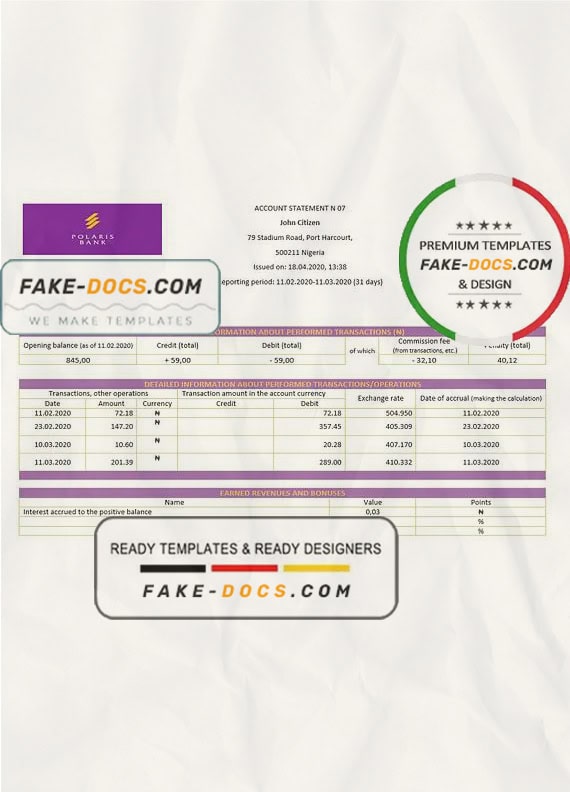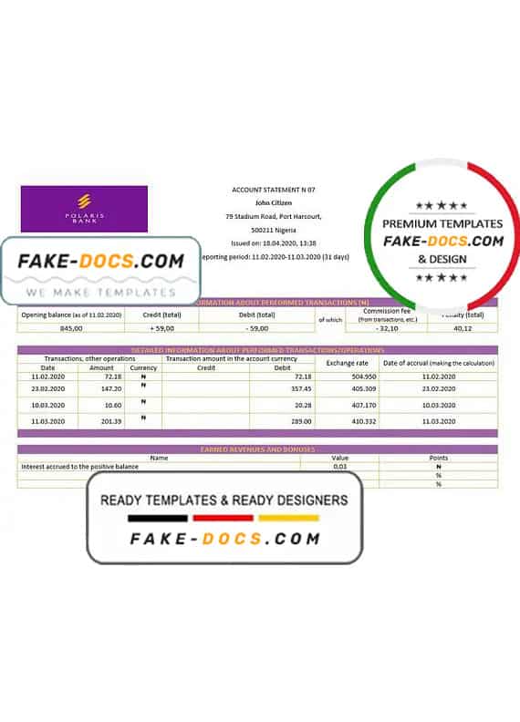 Grab now fully editable Nigeria Polaris Bank Statement Word Template from our website Fake Docs and put your own info to create Fake Bank Statement Word template and ready your own novelty documents. It’ll be so beneficial if your Bank Statement is expired, stolen or not available. We also have passport psd template, ID Card psd template, Bank Statement psd template, drivers license psd template & Utility bill psd template