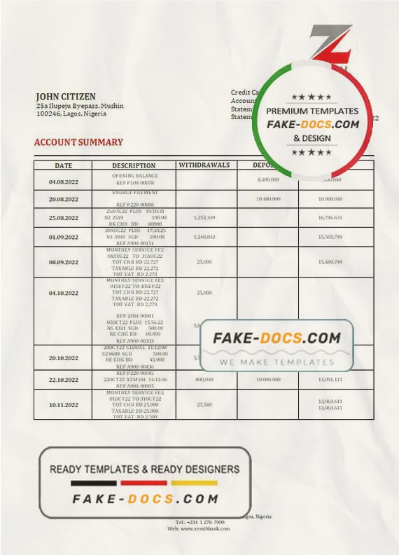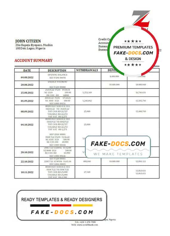 Grab now fully editable Nigeria Zenith Bank Statement Word Template from our website Fake Docs and put your own info to create Fake Bank Statement Word template and ready your own novelty documents. It’ll be so beneficial if your Bank Statement is expired, stolen or not available. We also have passport psd template, ID Card psd template, Bank Statement psd template, drivers license psd template & Utility bill psd template