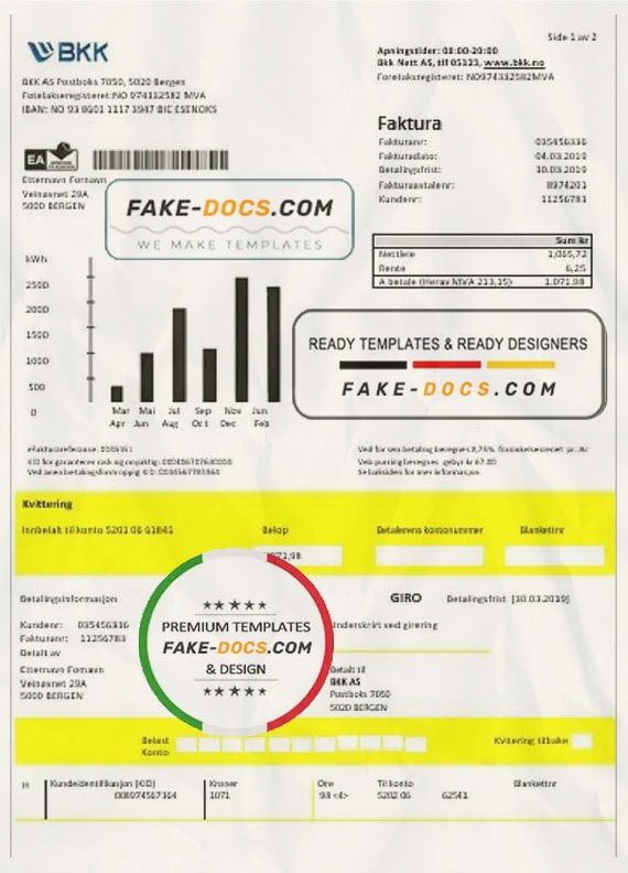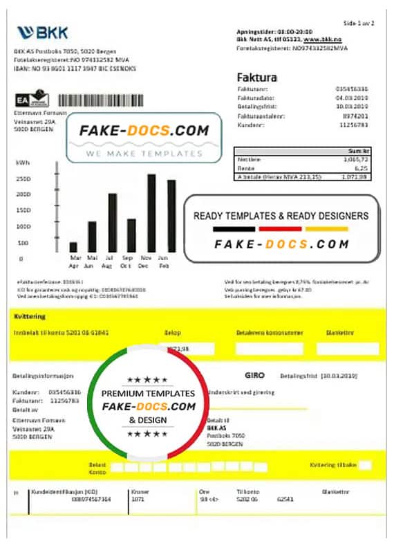 Grab now fully editable Norway BKK electricity utility bill Template from our website fake docs and put your own info to create a fake copy of Fake Norway BKK electricity Utility Bill for proof of address and ready your own novelty documents. It’ll be so beneficial if your utility bill is expired, stolen or not available. We also have passport psd template, ID Card psd template, Bank Statement psd template, drivers license psd template & Utility bill psd template