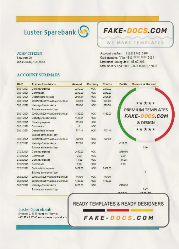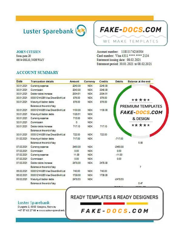 Grab now fully editable Norway Luster Sparebank Bank Statement Excel Template from our website Fake Docs and put your own info to create Fake Bank Statement template Excel and ready your own novelty documents. It’ll be so beneficial if your Bank Statement is expired, stolen or not available. We also have passport psd template, ID Card psd template, Bank Statement psd template, drivers license psd template & Utility bill psd template