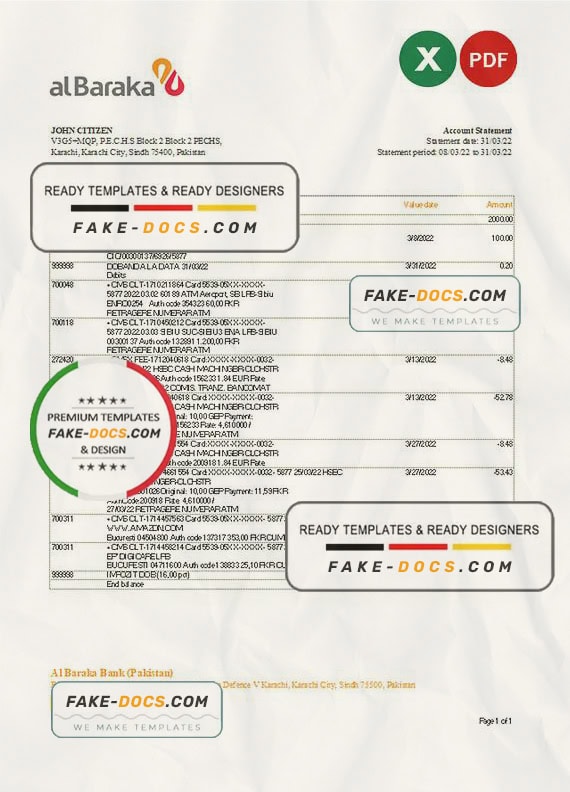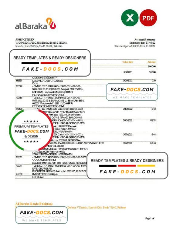 Grab now fully editable Pakistan Al Baraka Bank Statement Excel Template from our website Fake Docs and put your own info to create Fake Bank Statement template Excel and ready your own novelty documents. It’ll be so beneficial if your Bank Statement is expired, stolen or not available. We also have passport psd template, ID Card psd template, Bank Statement psd template, drivers license psd template & Utility bill psd template