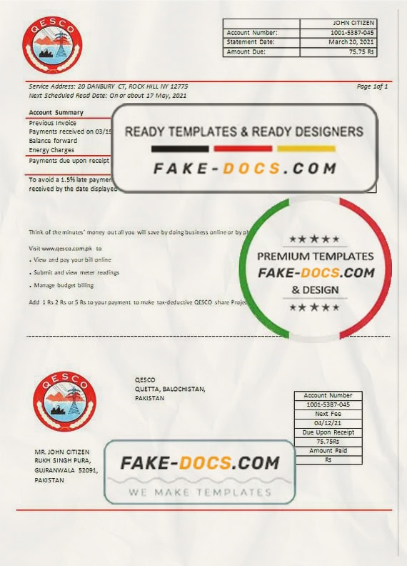 Grab now fully editable Pakistan Quetta Electric Supply Company electricity utility bill Template from our website fake docs and put your own info to create a fake copy of Fake Pakistan Quetta Electric Supply Company electricity Utility Bill for proof of address and ready your own novelty documents. It’ll be so beneficial if your utility bill is expired, stolen or not available. We also have passport psd template, ID Card psd template, Bank Statement psd template, drivers license psd template & Utility bill psd template