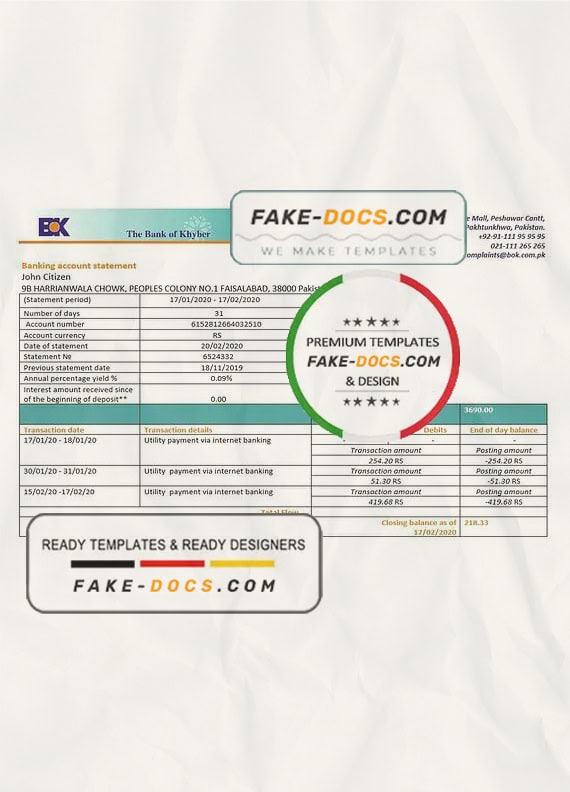 Grab now fully editable Pakistan The Bank of Khyber Bank Statement Word Template from our website Fake Docs and put your own info to create Fake Bank Statement Word template and ready your own novelty documents. It’ll be so beneficial if your Bank Statement is expired, stolen or not available. We also have passport psd template, ID Card psd template, Bank Statement psd template, drivers license psd template & Utility bill psd template