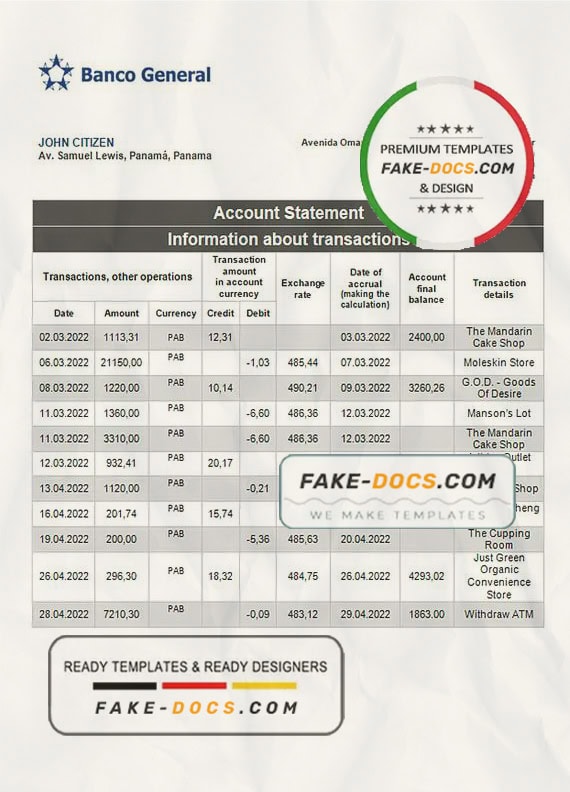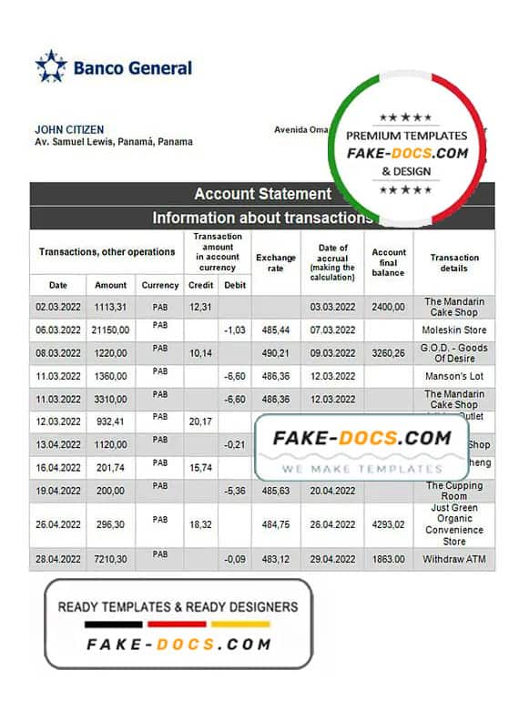 Grab now fully editable Panama Banco General Bank Statement Word Template from our website Fake Docs and put your own info to create Fake Bank Statement Word template and ready your own novelty documents. It’ll be so beneficial if your Bank Statement is expired, stolen or not available. We also have passport psd template, ID Card psd template, Bank Statement psd template, drivers license psd template & Utility bill psd template