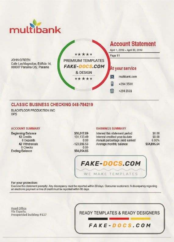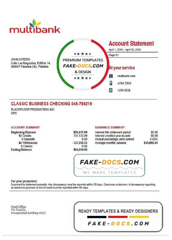 Grab now fully editable Panama Multibank proof of address Bank Statement Word Template from our website Fake Docs and put your own info to create Fake Bank Statement Word template and ready your own novelty documents. It’ll be so beneficial if your Bank Statement is expired, stolen or not available. We also have passport psd template, ID Card psd template, Bank Statement psd template, drivers license psd template & Utility bill psd template