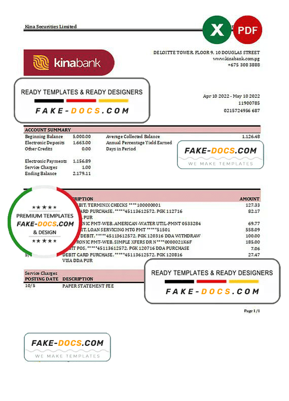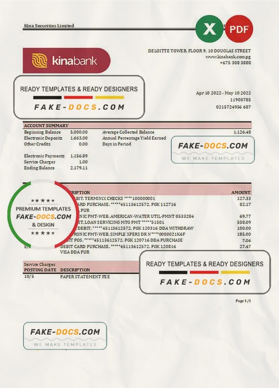 Papua New Guinea Kina Securities Limites Bank Statement template Excel. Fully editable Excel template. High quality template. Easy to customize, fonts included. you can edit this template and put any name, address, license number, Id number, birth date, height, weight, expire date, change photos etc. This Excel template is a easy to Editing.To modify this Excel template file you will need a Excel editing software such as Microsoft Excel. Never used low quality template. Your account may be suspended.