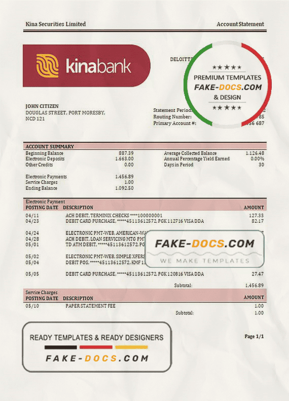 Grab now fully editable Papua New Guinea Kina Securities Limites Bank Statement Word Template from our website Fake Docs and put your own info to create Fake Bank Statement Word template and ready your own novelty documents. It’ll be so beneficial if your Bank Statement is expired, stolen or not available. We also have passport psd template, ID Card psd template, Bank Statement psd template, drivers license psd template & Utility bill psd template