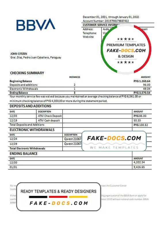 Grab now fully editable Paraguay BBVA Bank Statement Word Template from our website Fake Docs and put your own info to create Fake Bank Statement Word template and ready your own novelty documents. It’ll be so beneficial if your Bank Statement is expired, stolen or not available. We also have passport psd template, ID Card psd template, Bank Statement psd template, drivers license psd template & Utility bill psd template