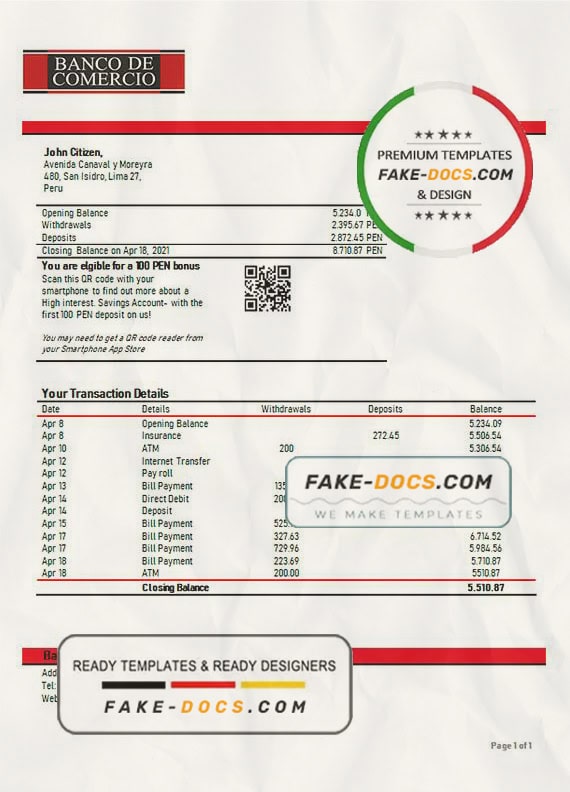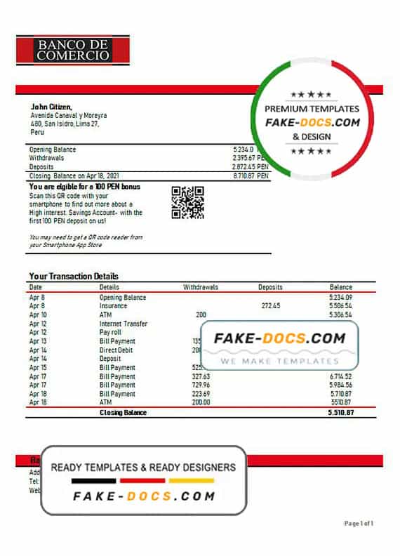 Grab now fully editable Peru Banco de Comercio Bank Statement Word Template from our website Fake Docs and put your own info to create Fake Bank Statement Word template and ready your own novelty documents. It’ll be so beneficial if your Bank Statement is expired, stolen or not available. We also have passport psd template, ID Card psd template, Bank Statement psd template, drivers license psd template & Utility bill psd template