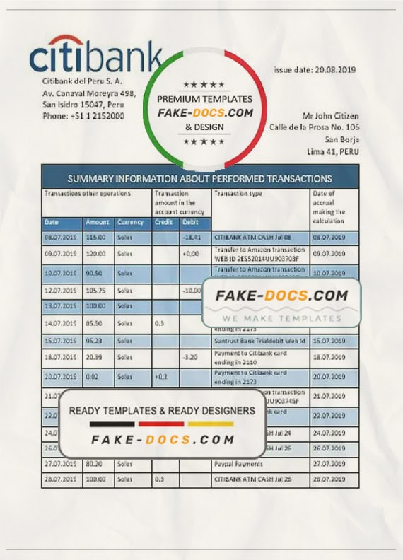 Grab now fully editable Peru Citibank Bank Statement Word Template from our website Fake Docs and put your own info to create Fake Bank Statement Word template and ready your own novelty documents. It’ll be so beneficial if your Bank Statement is expired, stolen or not available. We also have passport psd template, ID Card psd template, Bank Statement psd template, drivers license psd template & Utility bill psd template