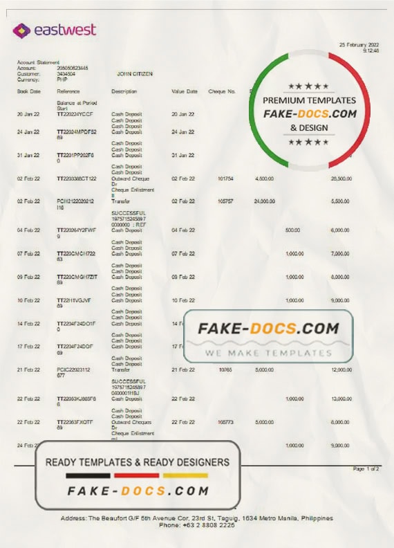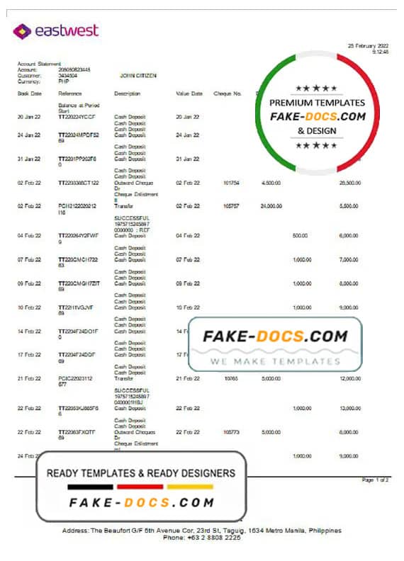 Grab now fully editable Philippines EastWest Bank Statement Word Template from our website Fake Docs and put your own info to create Fake Bank Statement Word template and ready your own novelty documents. It’ll be so beneficial if your Bank Statement is expired, stolen or not available. We also have passport psd template, ID Card psd template, Bank Statement psd template, drivers license psd template & Utility bill psd template