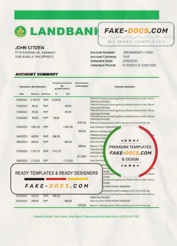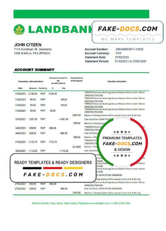 Grab now fully editable Philippines Land Bank of the Philippines Bank Statement Excel Template from our website Fake Docs and put your own info to create Fake Bank Statement template Excel and ready your own novelty documents. It’ll be so beneficial if your Bank Statement is expired, stolen or not available. We also have passport psd template, ID Card psd template, Bank Statement psd template, drivers license psd template & Utility bill psd template