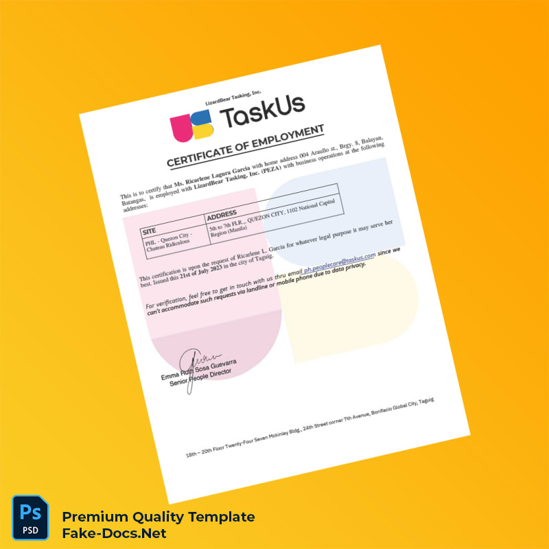 Streamline Your Employment Verification with the Philippines LizardBear Tasking Inc Employment Certificate Template (Word & PDF)