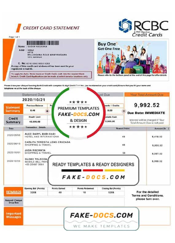 Grab now fully editable Philippines Rizal Commercial Banking Corporation (RCBC) Bank Statement Word Template from our website Fake Docs and put your own info to create Fake Bank Statement Word template and ready your own novelty documents. It’ll be so beneficial if your Bank Statement is expired, stolen or not available. We also have passport psd template, ID Card psd template, Bank Statement psd template, drivers license psd template & Utility bill psd template