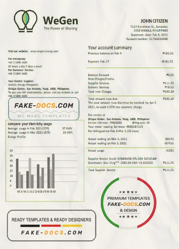 Grab now fully editable Philippines WeGen Energy Philippines utility bill Template from our website fake docs and put your own info to create a fake copy of Fake Philippines WeGen Energy Philippines Utility Bill for proof of address and ready your own novelty documents. It’ll be so beneficial if your utility bill is expired, stolen or not available. We also have passport psd template, ID Card psd template, Bank Statement psd template, drivers license psd template & Utility bill psd template
