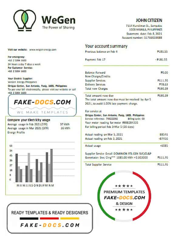 Philippines WeGen Energy Philippines utility bill Word template . Fully editable Word template. High quality template. Easy to customize, Layer based, fonts included. you can edit this template and put any name, address, license number, Id number, birth date, height, weight, expire date etc. This Word template is a easy to Editing.To modify this Word template file you will need a Word editing software such as Microsoft Word. Never used low quality template. Your account may be suspended.