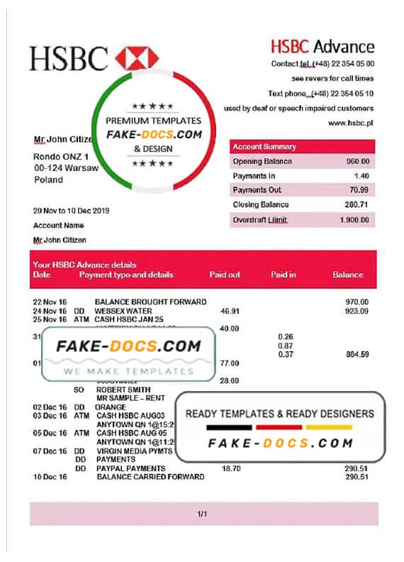 Grab now fully editable Poland HSBC Bank Statement Word Template from our website Fake Docs and put your own info to create Fake Bank Statement Word template and ready your own novelty documents. It’ll be so beneficial if your Bank Statement is expired, stolen or not available. We also have passport psd template, ID Card psd template, Bank Statement psd template, drivers license psd template & Utility bill psd template