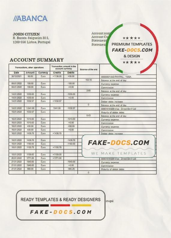 Grab now fully editable Portugal Abanca Bank Statement Word Template from our website Fake Docs and put your own info to create Fake Bank Statement Word template and ready your own novelty documents. It’ll be so beneficial if your Bank Statement is expired, stolen or not available. We also have passport psd template, ID Card psd template, Bank Statement psd template, drivers license psd template & Utility bill psd template