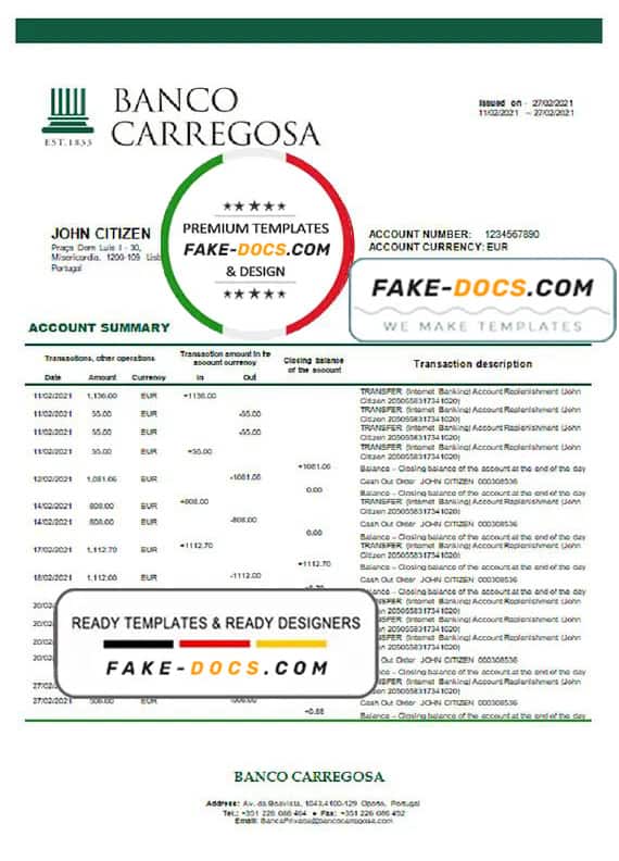Grab now fully editable Portugal Banco Carregosa Bank Statement Word Template from our website Fake Docs and put your own info to create Fake Bank Statement Word template and ready your own novelty documents. It’ll be so beneficial if your Bank Statement is expired, stolen or not available. We also have passport psd template, ID Card psd template, Bank Statement psd template, drivers license psd template & Utility bill psd template