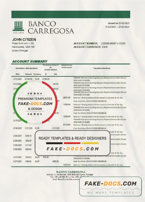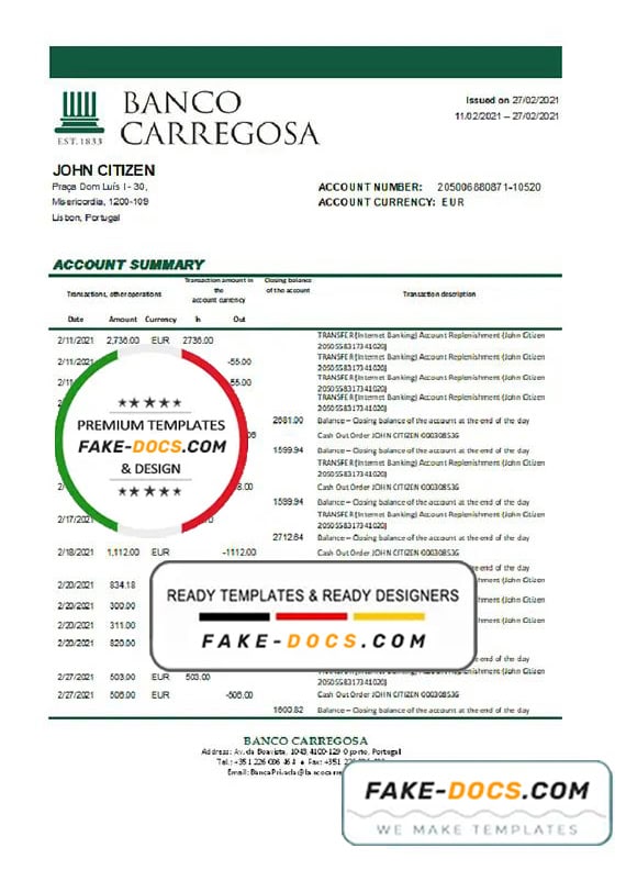 Grab now fully editable Portugal Banco Carregosa Bank Statement Excel Template from our website Fake Docs and put your own info to create Fake Bank Statement template Excel and ready your own novelty documents. It’ll be so beneficial if your Bank Statement is expired, stolen or not available. We also have passport psd template, ID Card psd template, Bank Statement psd template, drivers license psd template & Utility bill psd template