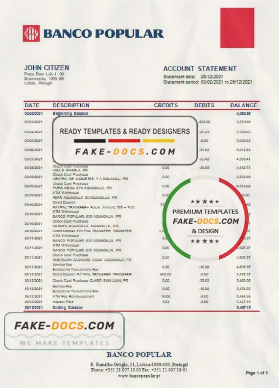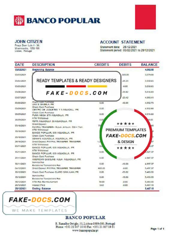 Grab now fully editable Portugal Banco Popular Bank Statement Word Template from our website Fake Docs and put your own info to create Fake Bank Statement Word template and ready your own novelty documents. It’ll be so beneficial if your Bank Statement is expired, stolen or not available. We also have passport psd template, ID Card psd template, Bank Statement psd template, drivers license psd template & Utility bill psd template