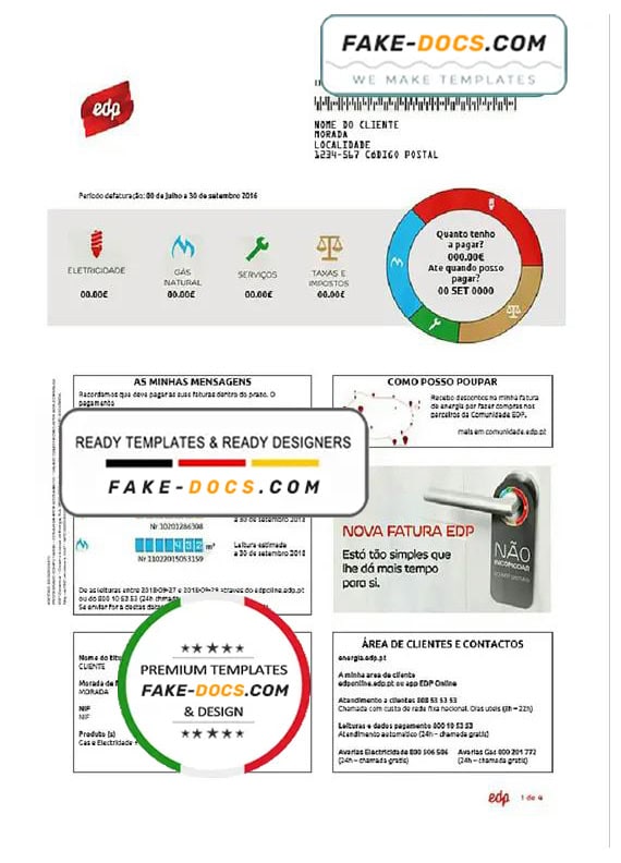Grab now fully editable Portugal EDP utility bill Template from our website fake docs and put your own info to create a fake copy of Fake Portugal EDP Utility Bill for proof of address and ready your own novelty documents. It’ll be so beneficial if your utility bill is expired, stolen or not available. We also have passport psd template, ID Card psd template, Bank Statement psd template, drivers license psd template & Utility bill psd template