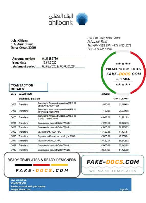 Grab now fully editable Qatar Ahlibank proof of address Bank Statement Word Template from our website Fake Docs and put your own info to create Fake Bank Statement Word template and ready your own novelty documents. It’ll be so beneficial if your Bank Statement is expired, stolen or not available. We also have passport psd template, ID Card psd template, Bank Statement psd template, drivers license psd template & Utility bill psd template
