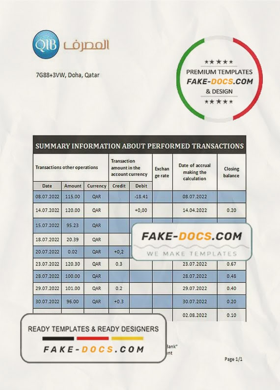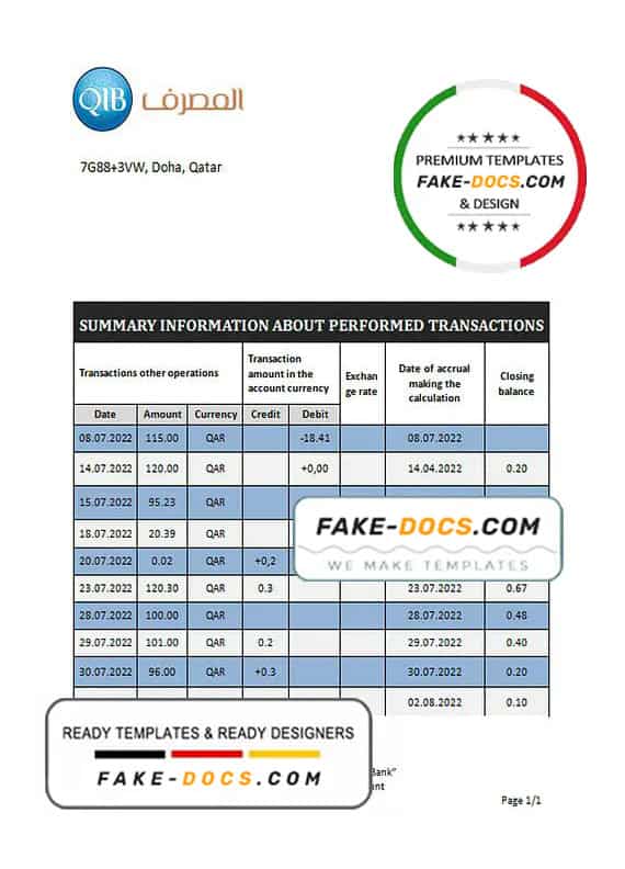 Grab now fully editable Qatar Qatar Islamic Bank Statement Word Template from our website Fake Docs and put your own info to create Fake Bank Statement Word template and ready your own novelty documents. It’ll be so beneficial if your Bank Statement is expired, stolen or not available. We also have passport psd template, ID Card psd template, Bank Statement psd template, drivers license psd template & Utility bill psd template