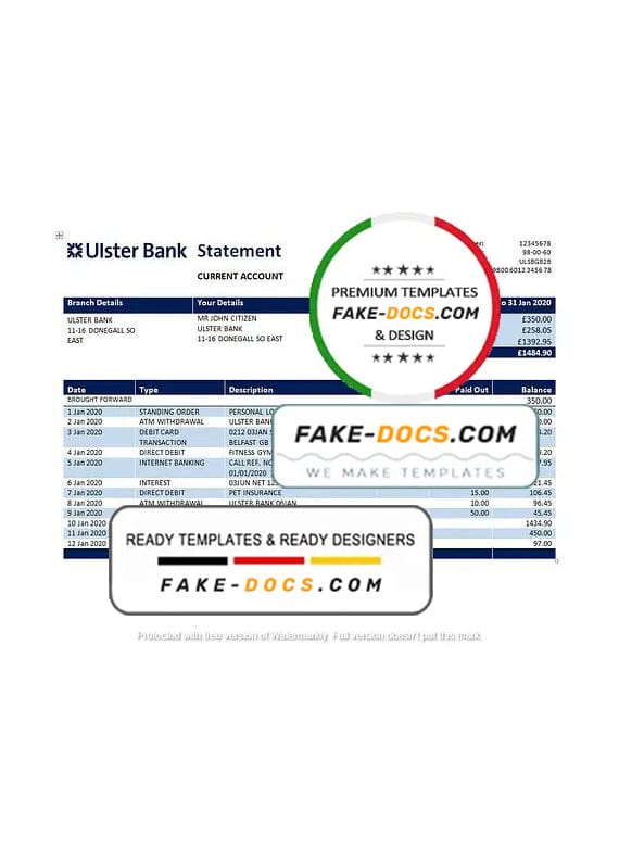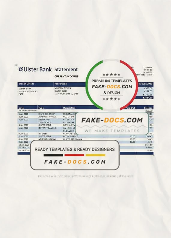 Grab now fully editable Republic of Ireland Ulster Bank Statement Word Template from our website Fake Docs and put your own info to create Fake Bank Statement Word template and ready your own novelty documents. It’ll be so beneficial if your Bank Statement is expired, stolen or not available. We also have passport psd template, ID Card psd template, Bank Statement psd template, drivers license psd template & Utility bill psd template