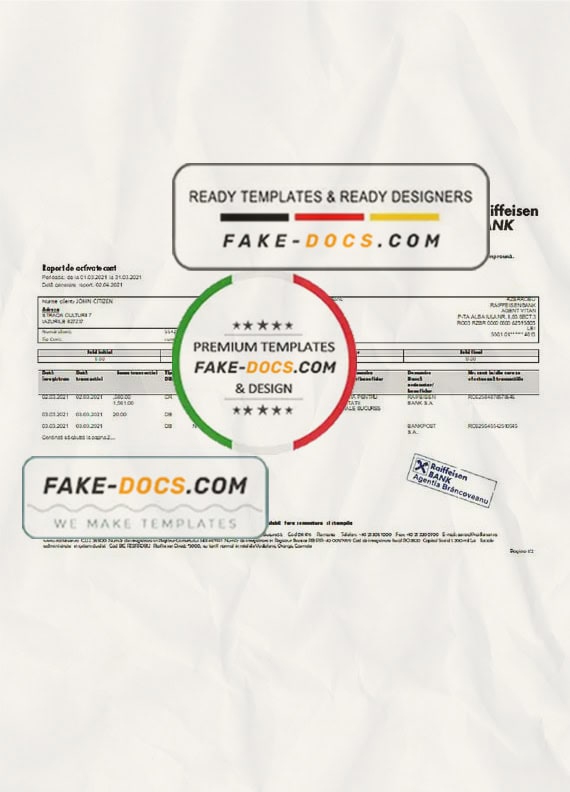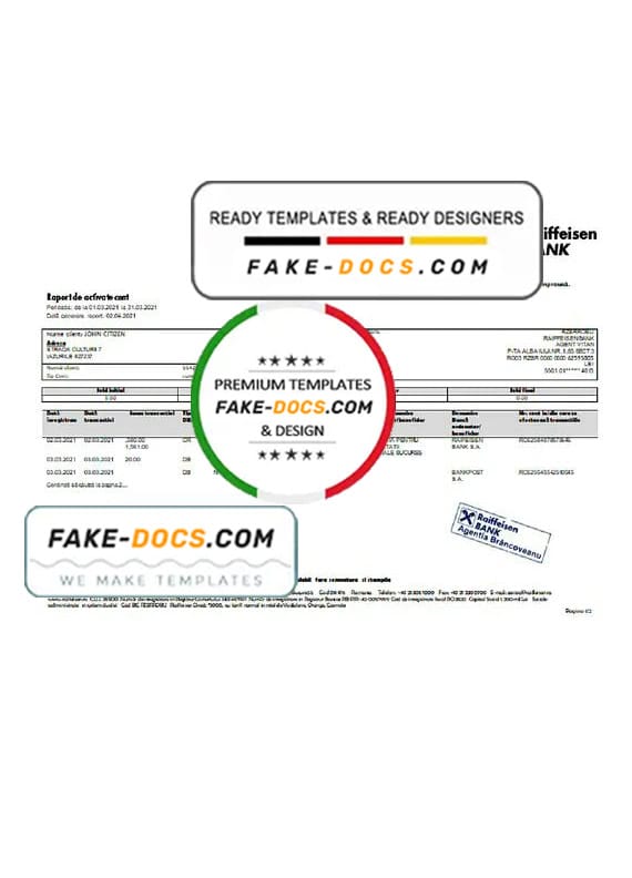 Grab now fully editable Romania Raiffeisen Bank Statement Word Template from our website Fake Docs and put your own info to create Fake Bank Statement Word template and ready your own novelty documents. It’ll be so beneficial if your Bank Statement is expired, stolen or not available. We also have passport psd template, ID Card psd template, Bank Statement psd template, drivers license psd template & Utility bill psd template