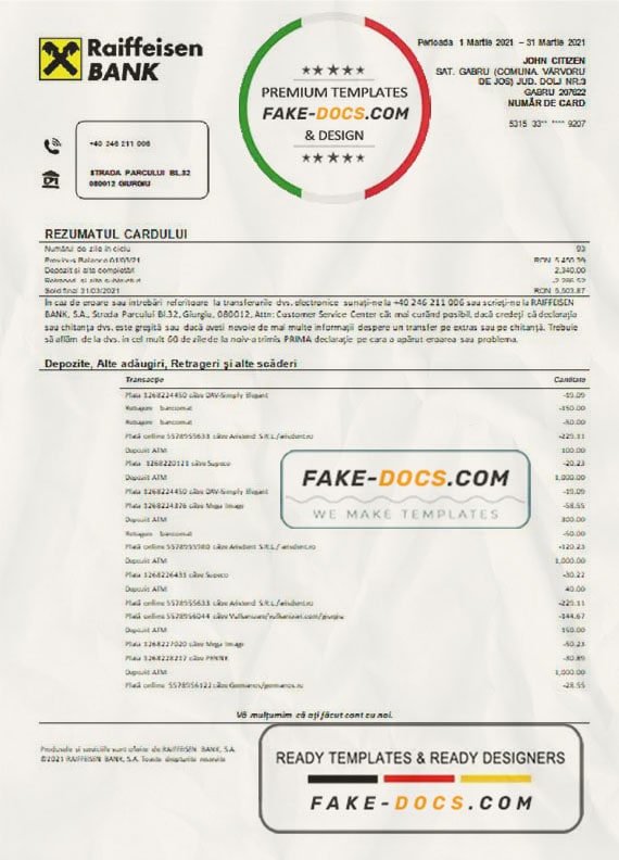Grab now fully editable Romania Raiffeisen Bank Statement Word Template from our website Fake Docs and put your own info to create Fake Bank Statement Word template and ready your own novelty documents. It’ll be so beneficial if your Bank Statement is expired, stolen or not available. We also have passport psd template, ID Card psd template, Bank Statement psd template, drivers license psd template & Utility bill psd template