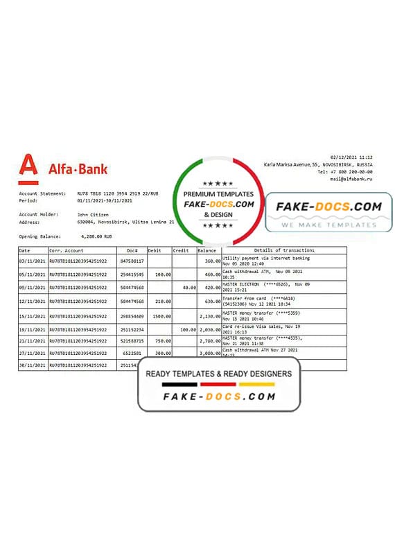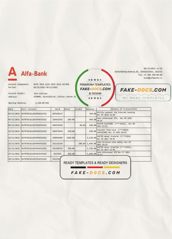 Russia Alfa bank proof of address statement template in Word and PDF format