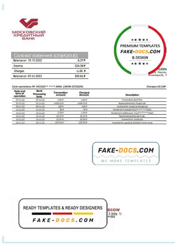 Grab now fully editable Russia Credit Bank of Moscow Bank Statement Word Template from our website Fake Docs and put your own info to create Fake Bank Statement Word template and ready your own novelty documents. It’ll be so beneficial if your Bank Statement is expired, stolen or not available. We also have passport psd template, ID Card psd template, Bank Statement psd template, drivers license psd template & Utility bill psd template