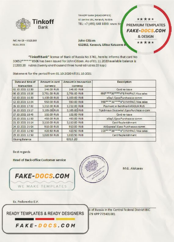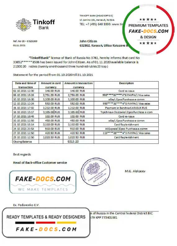 Grab now fully editable Russia Tinkoff Bank Statement Excel Template from our website Fake Docs and put your own info to create Fake Bank Statement template Excel and ready your own novelty documents. It’ll be so beneficial if your Bank Statement is expired, stolen or not available. We also have passport psd template, ID Card psd template, Bank Statement psd template, drivers license psd template & Utility bill psd template