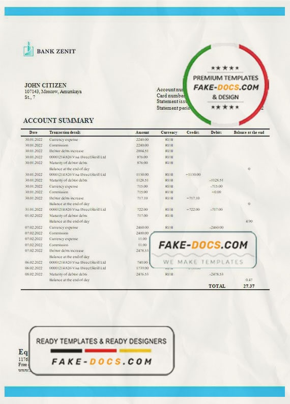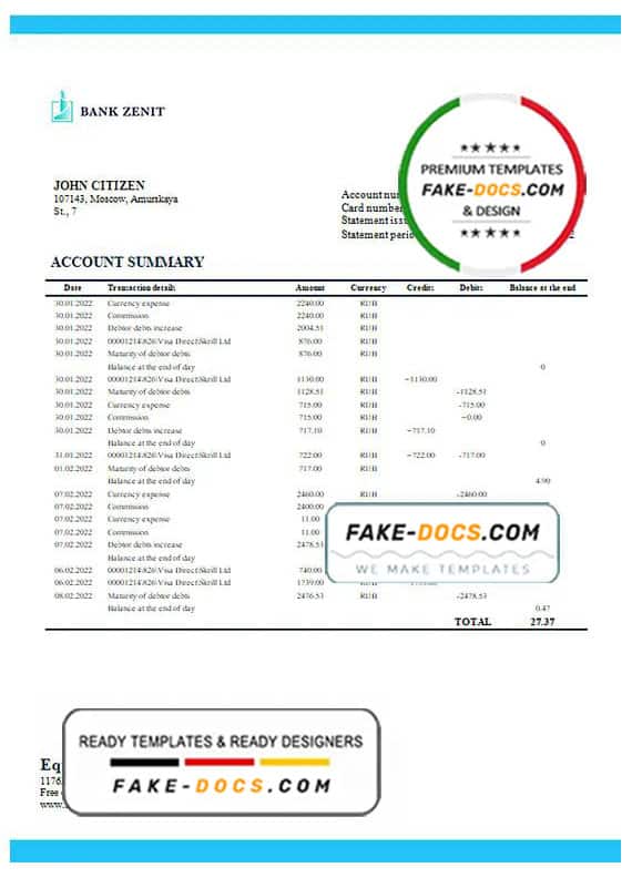 Grab now fully editable Russia Zenit Bank Bank Statement Word Template from our website Fake Docs and put your own info to create Fake Bank Statement Word template and ready your own novelty documents. It’ll be so beneficial if your Bank Statement is expired, stolen or not available. We also have passport psd template, ID Card psd template, Bank Statement psd template, drivers license psd template & Utility bill psd template