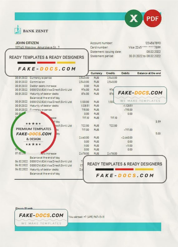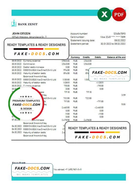 Grab now fully editable Russia Zenit Bank Statement Excel Template from our website Fake Docs and put your own info to create Fake Bank Statement template Excel and ready your own novelty documents. It’ll be so beneficial if your Bank Statement is expired, stolen or not available. We also have passport psd template, ID Card psd template, Bank Statement psd template, drivers license psd template & Utility bill psd template