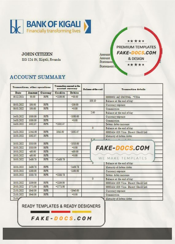 Grab now fully editable Rwanda Bank of Kigali Bank Statement Word Template from our website Fake Docs and put your own info to create Fake Bank Statement Word template and ready your own novelty documents. It’ll be so beneficial if your Bank Statement is expired, stolen or not available. We also have passport psd template, ID Card psd template, Bank Statement psd template, drivers license psd template & Utility bill psd template