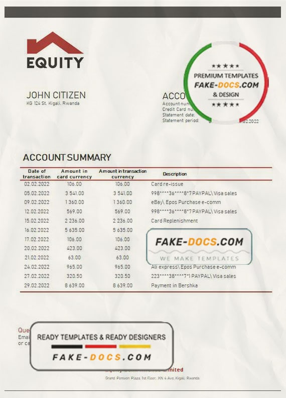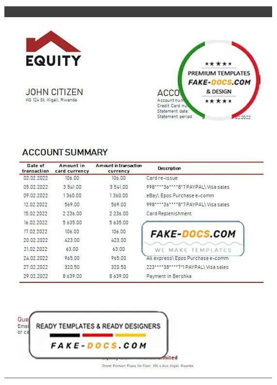 Grab now fully editable Rwanda Equity Bank Statement Word Template from our website Fake Docs and put your own info to create Fake Bank Statement Word template and ready your own novelty documents. It’ll be so beneficial if your Bank Statement is expired, stolen or not available. We also have passport psd template, ID Card psd template, Bank Statement psd template, drivers license psd template & Utility bill psd template