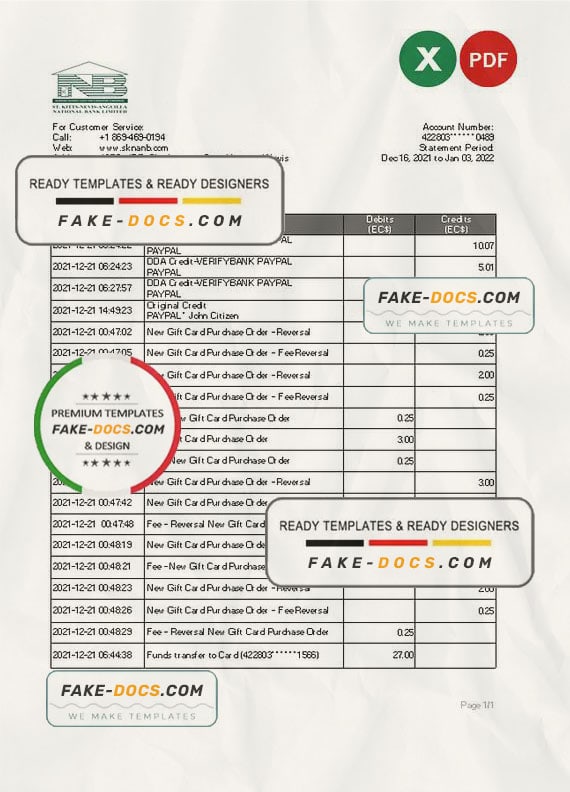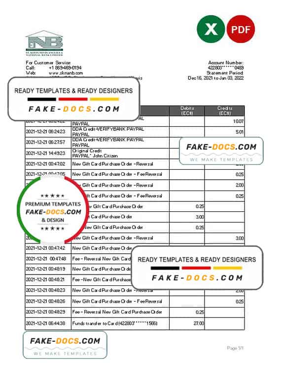 Grab now fully editable Saint Kitts and Nevis SKNA Bank Statement Excel Template from our website Fake Docs and put your own info to create Fake Bank Statement template Excel and ready your own novelty documents. It’ll be so beneficial if your Bank Statement is expired, stolen or not available. We also have passport psd template, ID Card psd template, Bank Statement psd template, drivers license psd template & Utility bill psd template