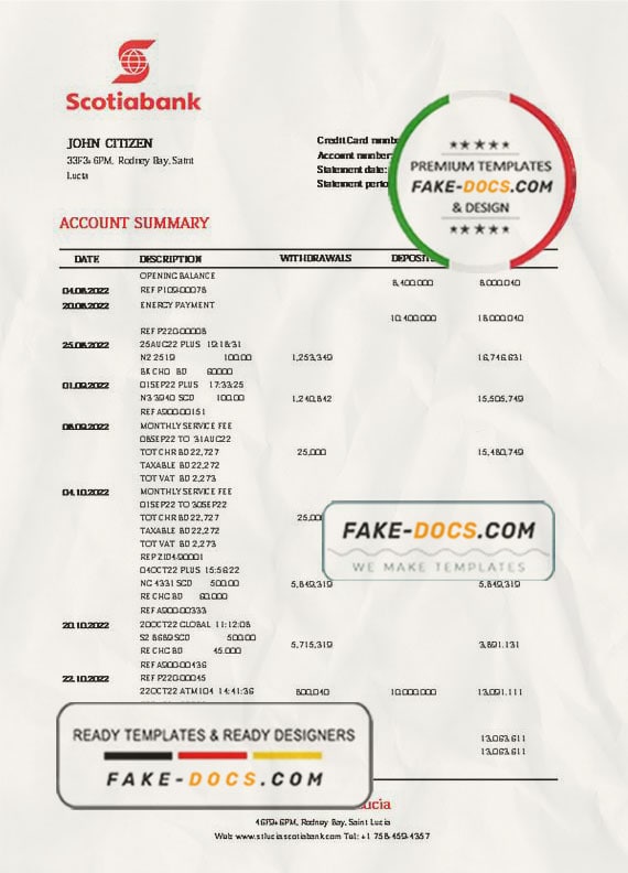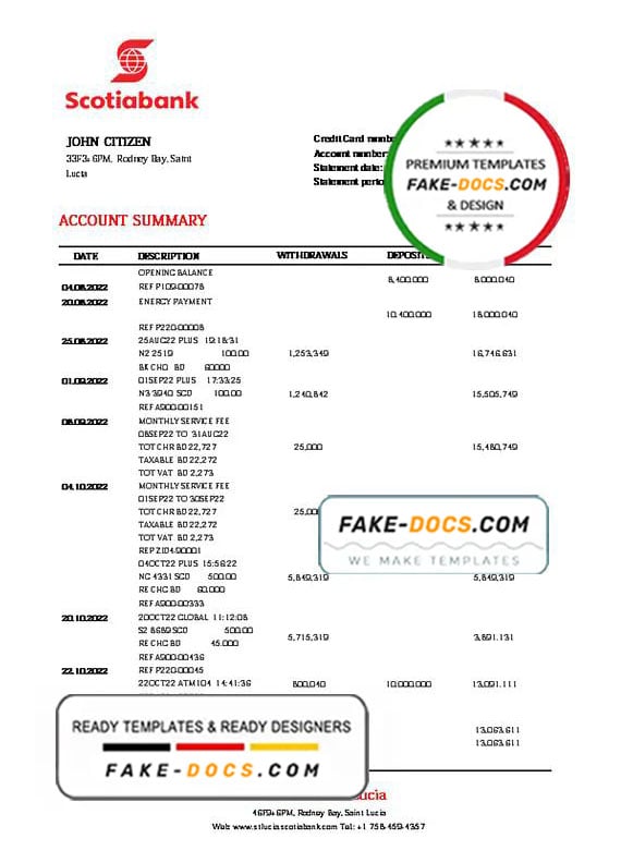 Grab now fully editable Saint Lucia Scotiabank Bank Statement Word Template from our website Fake Docs and put your own info to create Fake Bank Statement Word template and ready your own novelty documents. It’ll be so beneficial if your Bank Statement is expired, stolen or not available. We also have passport psd template, ID Card psd template, Bank Statement psd template, drivers license psd template & Utility bill psd template