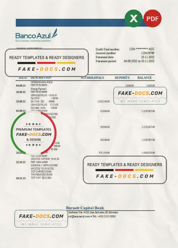 Salvador Banco Azul Bank Statement Template in Excel an PDF format use for :