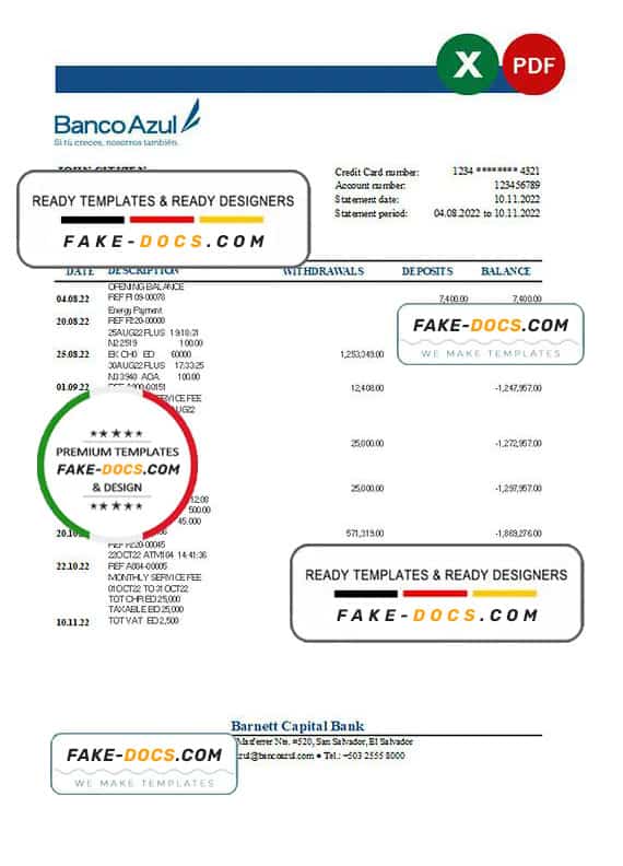Salvador Banco Azul Bank Statement template Excel. Fully editable Excel template. High quality template. Easy to customize, fonts included. you can edit this template and put any name, address, license number, Id number, birth date, height, weight, expire date, change photos etc. This Excel template is a easy to Editing.To modify this Excel template file you will need a Excel editing software such as Microsoft Excel. Never used low quality template. Your account may be suspended.