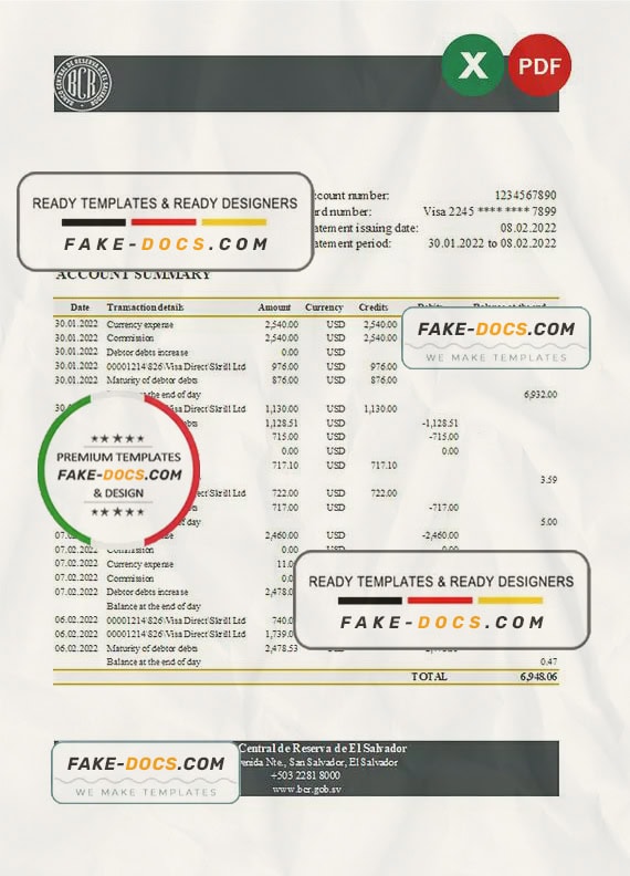 Salvador Banco Central de Reserva of El Salvador Bank Statement template Excel. Fully editable Excel template. High quality template. Easy to customize, fonts included. you can edit this template and put any name, address, license number, Id number, birth date, height, weight, expire date, change photos etc. This Excel template is a easy to Editing.To modify this Excel template file you will need a Excel editing software such as Microsoft Excel. Never used low quality template. Your account may be suspended.